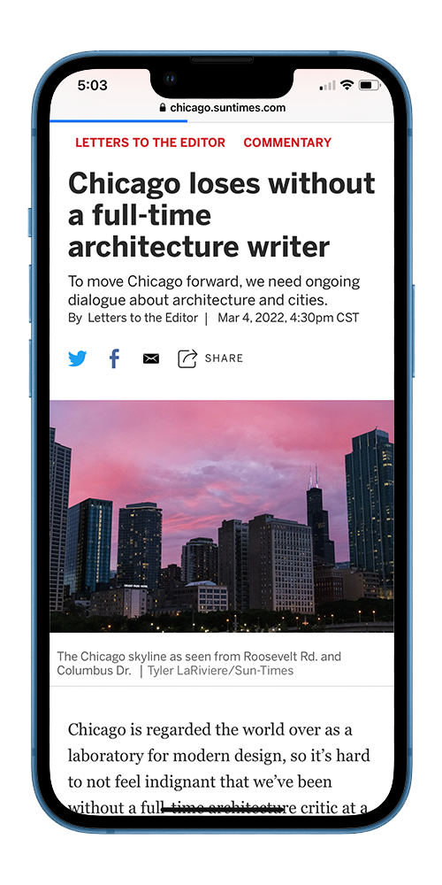 The Chicago Sun-Times publishes an Op-Ed from former CAC CEO Lynn Osmond entitled, Chicago Loses Without a Full-Time Architecture Writer. Ultimately read by over 47,000, the piece outlined the threats to Chicago’s standing as a global design hub as well as waning civic dialogue that comes without a critic’s byline at a major Chicago paper. The opinion piece was one part of a larger chorus of actors working on this issue, but soon after, it was announced that Lee Bey would have a new monthly column in the Chicago Sun-Times Sunday edition.